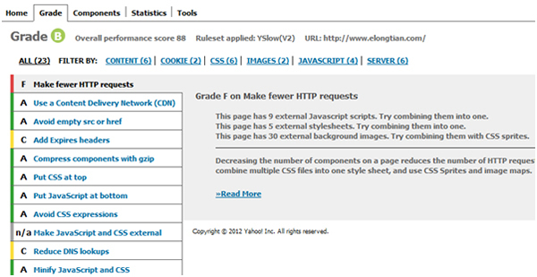 2)YSlow可以对网站的页面进行剖析,并通知你为了进步网站功能,怎么根据某些规矩而进行优化。