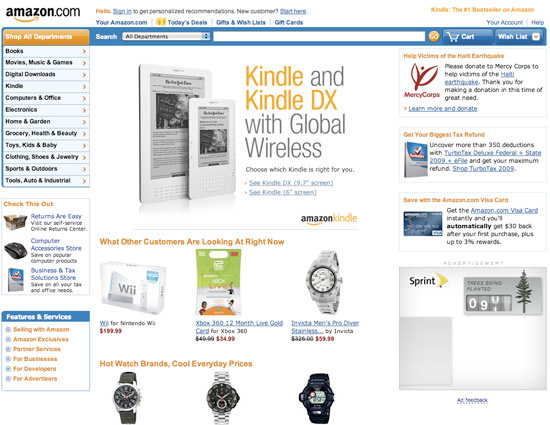 亚马逊的网站大多是白色的,白色有着最佳的比照度和可读性。它还显露出整齐性,让用户能自在地阅览网站。以橙色和蓝色的强调色则让用户能感到安靖、振奋,也让他们期望找到最满足的收购。